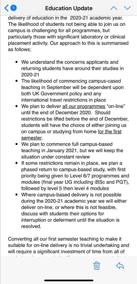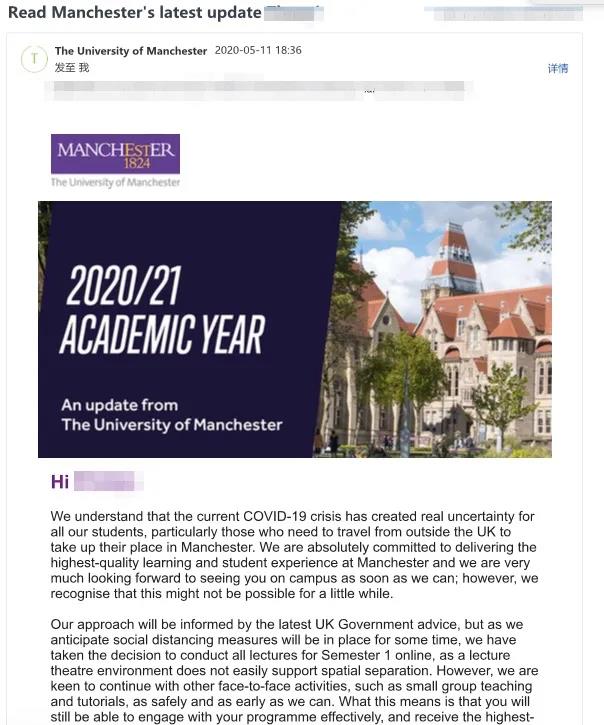 在邮件中,曼大表示,考虑到英政府很可能不会在9月放开“社交距离”政策,所以第1学期的课程将转为线上。