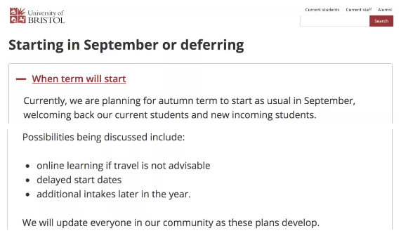 华威大学官网并没有对秋季开学情况做过多的说明,只是在延迟入学的部分写明,任何人都没有必要推迟入学。如果学生有需要,仍可以按照正常方式申请defer。如此看来,华威大学很可能是正常开学,并没有调整为线上授课的打算。
