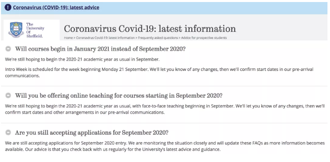 谢菲尔德大学表示,计划在9月正常开学,并采用线下授课的方式。如果变动,学校将会另行通知。同时谢菲尔德大学还表示,仍在接受2020年9月入学的课程申请。