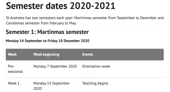 圣安德鲁斯大学秋季学期时间:2020年9月14日至2020年12月18日