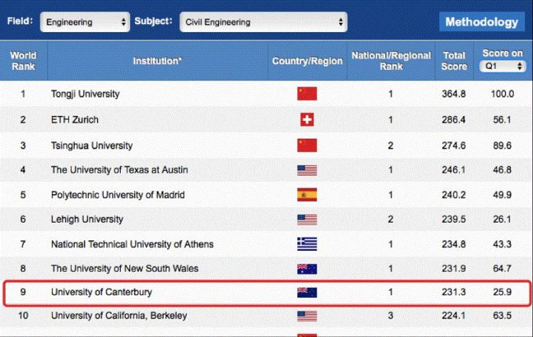 坎特伯雷大学土木工程专业荣居世界前10,成为新西兰八所大学唯一进入世界前10的学科。